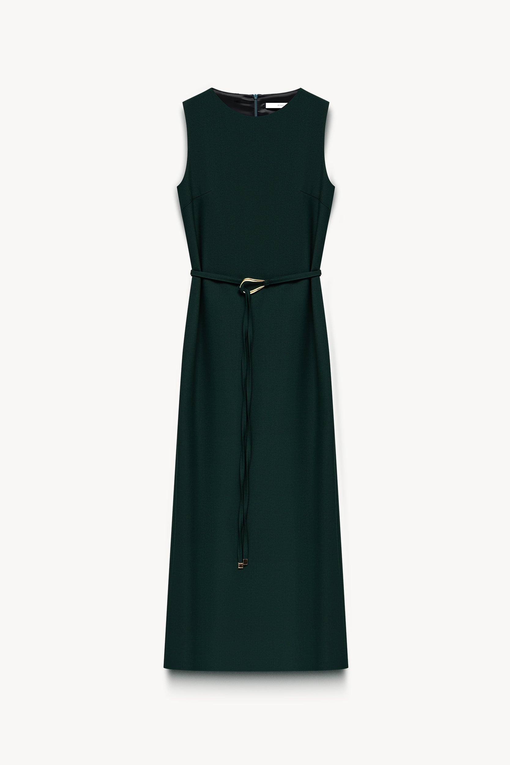 A timeless tailored piece in ecru or dark emerald. The straight-fit midaxi silhouette features a round neck and back slit for elegant movement. Concealed back zip and self-fabric belt create clean lines. Lined in smooth polyester for comfort. Wear with loafers for office sophistication or layer over a turtleneck for seasonal transitions.
